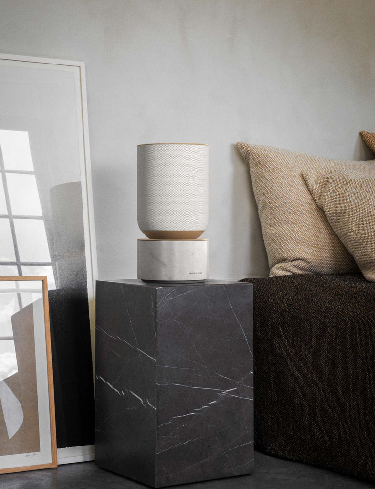 Bang & Olufsen BeoSound Balance. The BeoSound Balance is a 360 degree living room filling speaker with internet radio, Airplay 2 and Google cast